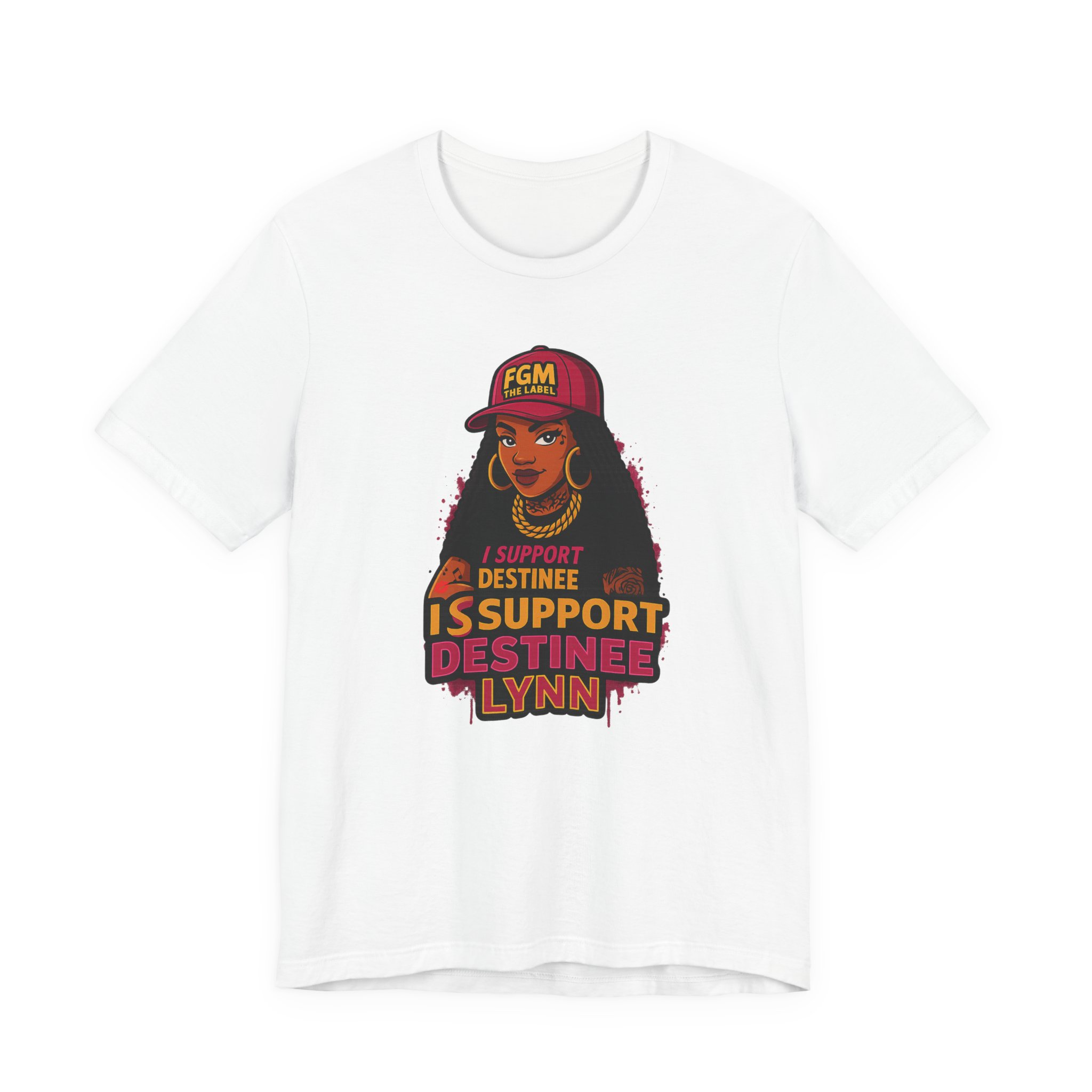 Light, confident, and made to be worn loudly. This soft cotton tee carries a bold illustrated portrait and empowering script that reads like a rallying cry — a shirt for fans, friends, and anyone who wants to make their support visible. The front shows a stylized woman wearing a cap with FGM branding and layered warm tones; the back features the FGM mark in bright pink with a crown accent, giving the tee a badge-like finish. Breathable Airlume combed cotton feels smooth against the skin and keeps the print crisp. Wear it to street events, fan meetups, or casual days when you want your voice — and your style — front and center.